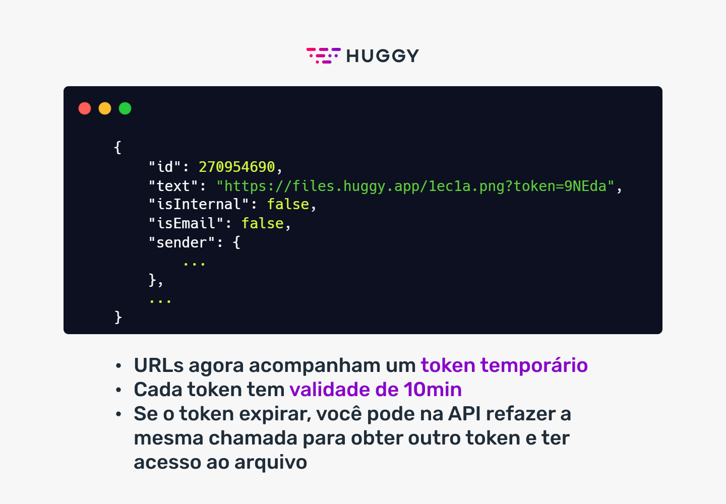 Quando você receber um evento de Webhook ou fizer uma chamada de API que retorna o endereço de um arquivo armazenado pela plataforma, a URL agora passa a conter um token de acesso com duração de 10min.