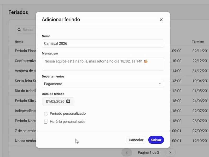 Você pode definir um ou mais dias para as datas especiais e personalizar o seu horário, criando comunicações especiais para recessos, feriados estendidos e datas com horário reduzido de atendimento.