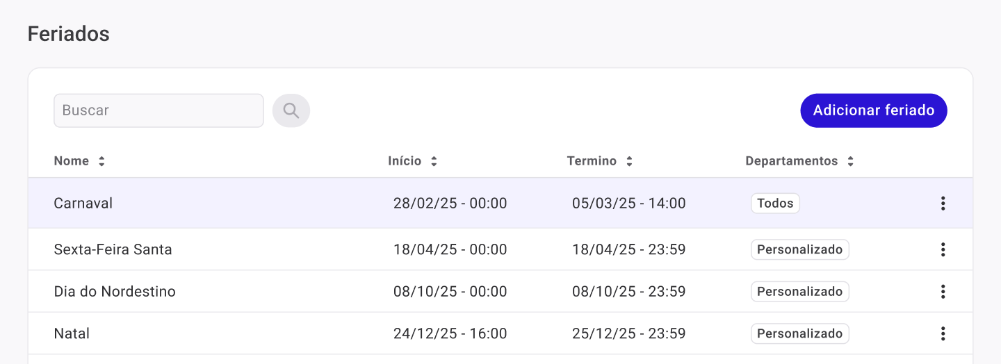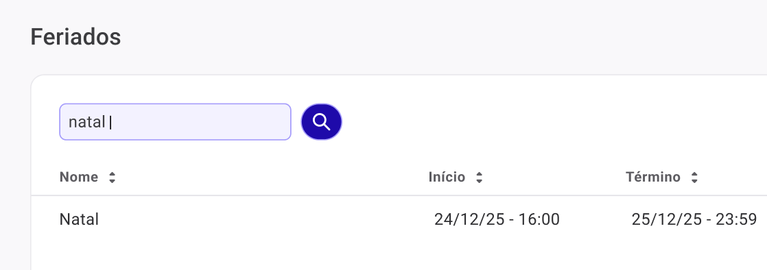 Use a nova barra de pesquisa para localizar com facilidade os feriados cadastrados e fazer as configurações necessárias conforme sua necessidade.